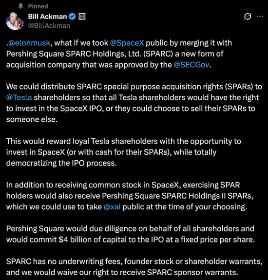 Ackman提议将SpaceX与其旗下潘兴广场SPARC控股公司(PershingSquareSPARCHoldings)合并,该工具已获美国证券交易委员会批准。
